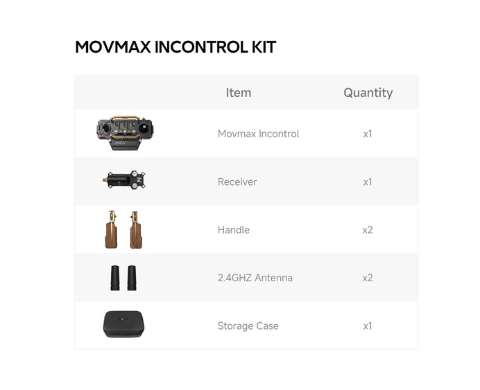 A MOVMAX Incontrol vezeték nélküli vezérlő a DJI Ronin számára pontos, testreszabható gimbal vezérlést biztosít 2,4 GHz-en keresztül, akár 150 méteres távolságig, állítható háromtengelyes sebesség/zóna beállításokkal, egy kattintással központosítható, REC indítóval, teleszkópos szénszálas joystickokkal, levehető fa markolatokkal és cserélhető 3350 mAh 18650 akkumulátorral rendelkezik, amely akár 15 óra üzemidőt biztosít; teljes mértékben kompatibilis a DJI RS 4 Pro, RS 4, RS 3 Pro és RS 2 (nem RS 3) modellekkel.