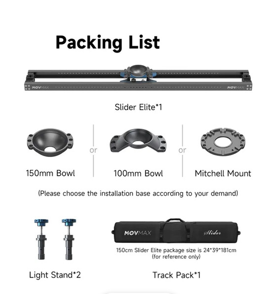 A MOVMAX Slider Elite 70" 100 mm-es tálcás rögzítéssel rendkívül sima, csendes kézi csúszást biztosít a 70,8 hüvelykes, masszív alumínium sínek mentén, súrlódásalapú kocsin, amely akár 55,1 fontot is elbír, 100 mm-es tálcás rögzítéssel professzionális folyadékos fejekhez és kettős 5/8 hüvelykes állványadapterekkel, fék-/csillapító gombokkal és hordtáskával a könnyű szállítás és a filmkészítéshez szükséges követés érdekében.