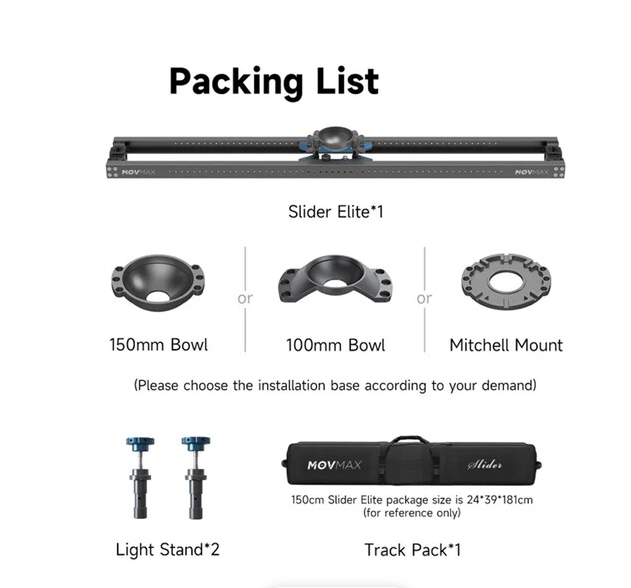 A MOVMAX Slider Elite Mitchell Mount (47,2") precíz, csendes lineáris kameramozgást biztosít robusztus alumínium síneken, súrlódásalapú követő kocsival és integrált Mitchell talppal, amely biztos rögzítést nyújt közepes és nagy méretű, legfeljebb 55,1 lb súlyú kamerarendszerekhez. A kézi működtetést állítható fék- és lengéscsillapító gombok segítik a sebesség és a leállás szabályozásában, míg a világítóállvány-adaptereken található kettős 5/8" baby pin csatlakozók stabil magasságbeállítást tesznek lehetővé C-állványokon vagy háromlábú állványokon. A teljes rendszer a mellékelt hordtáskába csomagolható, így ideális stúdió- vagy terepi produkciókhoz, ahol sima, megismételhető csúszó felvételekre van szükség.