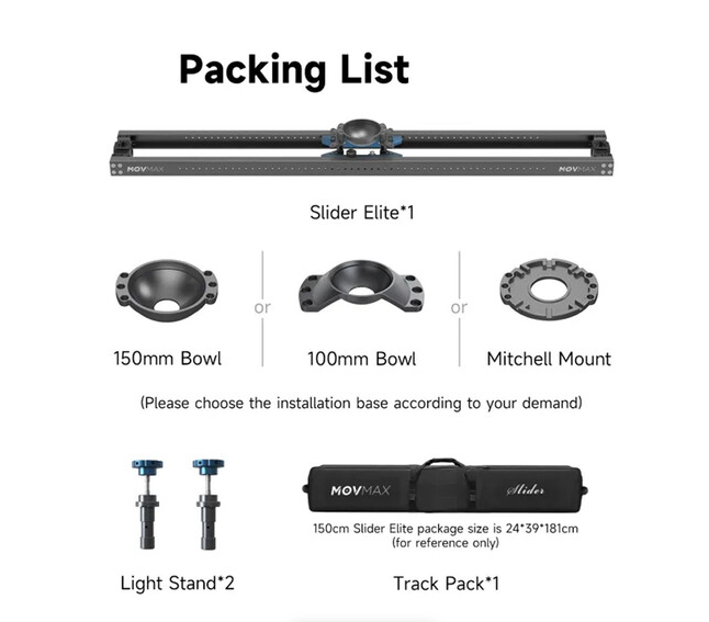 A MOVMAX Camera Slider Elite 82" Mitchell Mount egy professzionális, nagy teherbírású kézi kameracsúszka, amely 82,6" hosszú alumínium sínekkel és súrlódásalapú csúszórendszerrel rendelkezik, így rendkívül sima, csendes követő felvételek készítésére alkalmas. Közepes és nagy méretű filmkamerákhoz tervezve, integrált követő kocsija Mitchell lapos alapú rögzítéssel rendelkezik, míg a fék- és lengéscsillapító vezérlőgombok lehetővé teszik a pontos ellenállás beállítását. A csúszka legfeljebb 25 kg-os terhelést bír, és két világítóállvány-adapterrel (5/8"-os csatlakozóval) rendelkezik, amelyekkel könnyen felszerelhető C-állványokra vagy világítóállványokra, valamint egy hordtáskával is ellátott a szállításhoz.