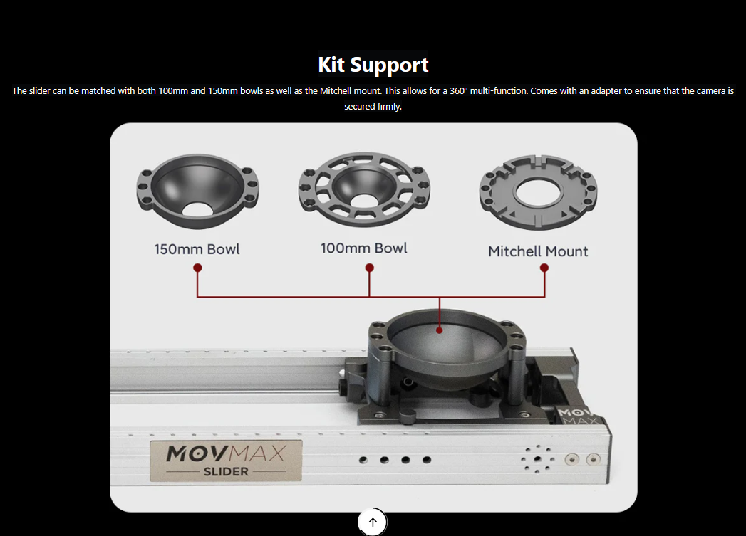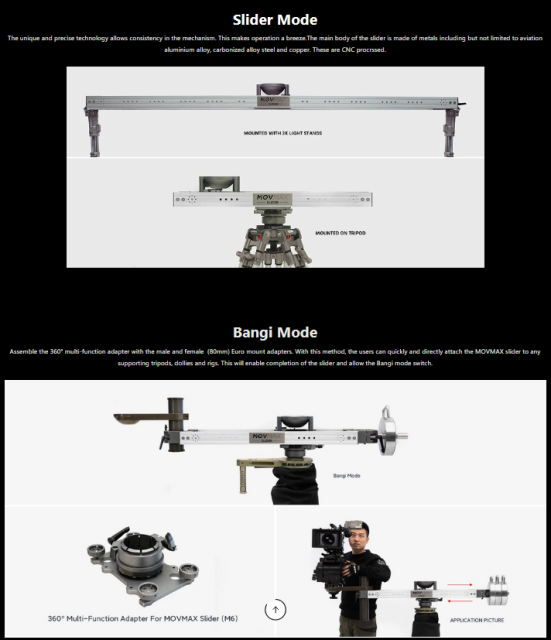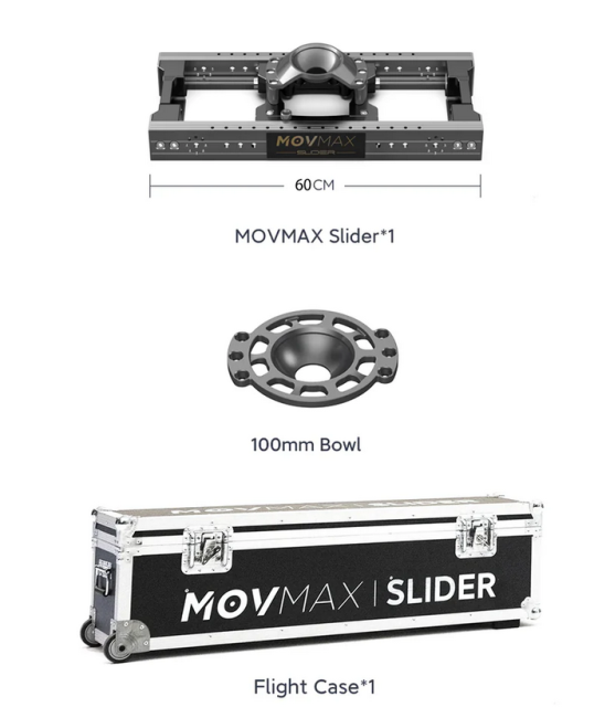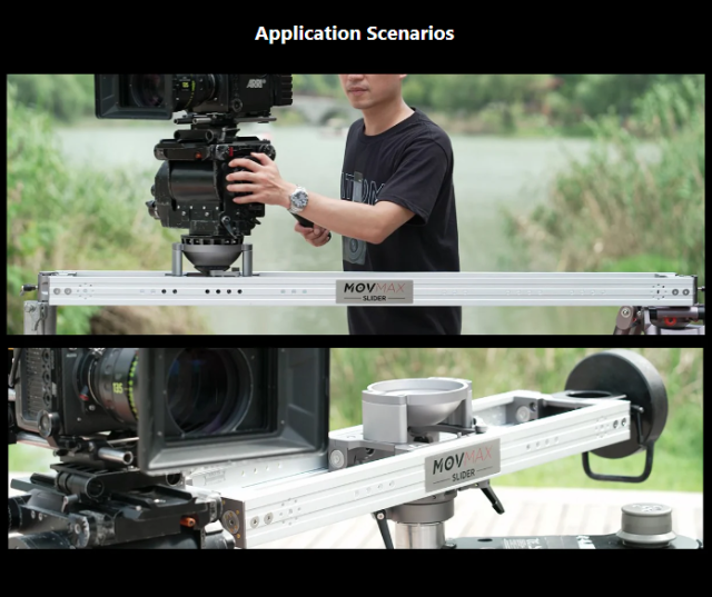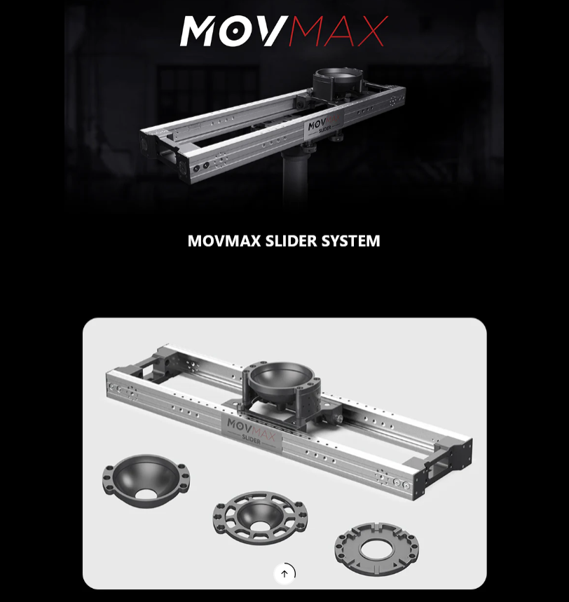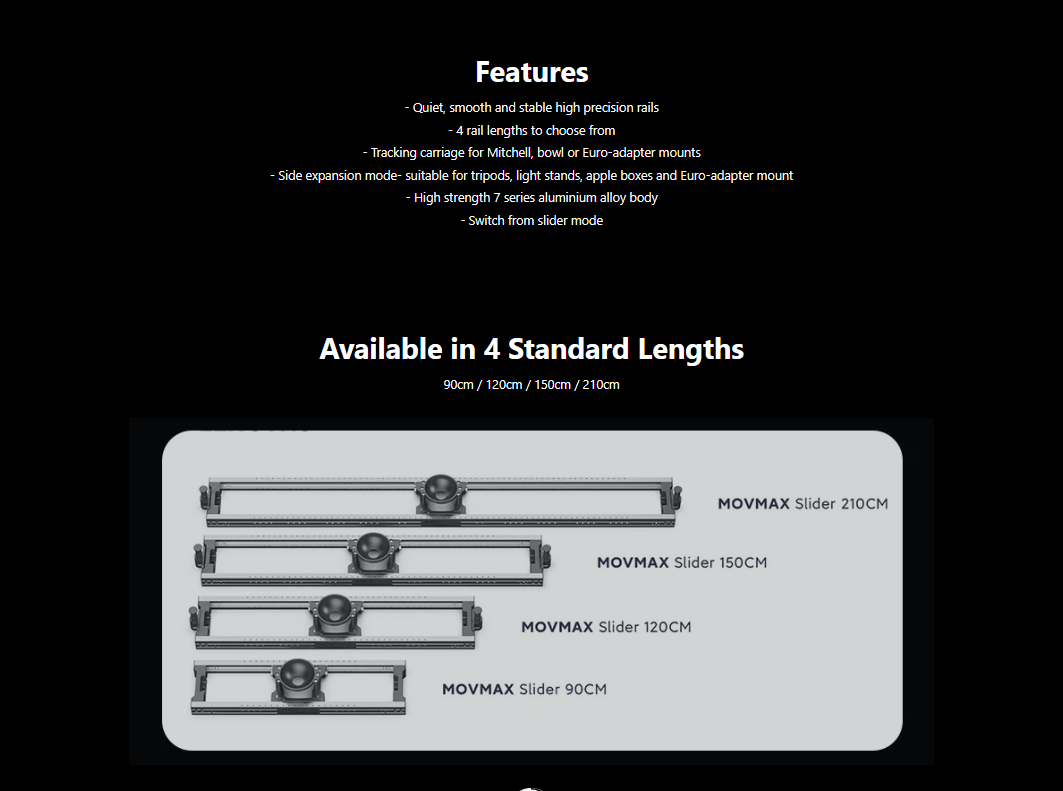 A MOVMAX Slider System egy precíziós tervezésű kameracsúszka, amelyet professzionális filmkészítéshez terveztek, és 60 cm, 90 cm, 120 cm, 150 cm, 180 cm és 210 cm hosszúságban kapható. Csendes, sima, nagy pontosságú sínekkel, állványokkal vagy világítási állványokkal való használatra szolgáló oldalsó kiterjesztési móddal, valamint 100 mm/150 mm-es tálcsatlakozókkal vagy Mitchell-csatlakozóval kompatibilis, mindez egy robusztus 7-es sorozatú alumíniumötvözetből készült vázon.