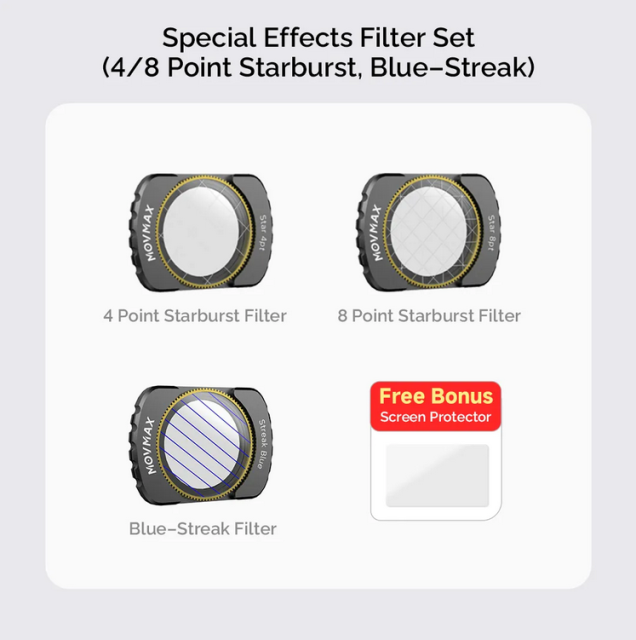 A DJI Pocket 3-hoz készült MOVMAX speciális effekt szűrőkészlet 4- és 8-pontos csillagszűrőkkel szabadjára engedi a filmes kreativitást, amelyek az utcai lámpák és fényszórók fényforrásait ragyogó csillagmintákká alakítják, valamint egy Blue Streak szűrővel, amely sci-fi kék csíkokat varázsol a mozgó fények köré éjszakai jelenetekben – mindezt mágneses rendszer segítségével, amely dinamikus felvételek során könnyedén cserélhető.