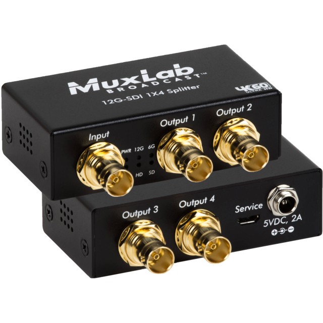A MuxLab 12G-SDI 1x4 4K60 osztó/elosztó 4 kijelzőhöz lehetővé teszi egy 12G/6G/3G/HD/SD-SDI forrás elosztását és erősítését akár négy 12G/6G/3G/HD/SD-SDI kijelzőre. Az elosztó akár UHD 4K (3840 X 2160) videót és HD hangot is támogat, beleértve a 480i (SD-SDI), 720p/1080i (HD-SDI), 1080p (3G-SDI), 4K30 (6G-SDI) és 4K60 (12G-SDI) videókat. A készülék automatikusan érzékeli a 12G/6G/3G/HD/SD/SD-SDI jelet, és a forrás és a kijelzők közötti távolságok meghosszabbítása érdekében a kimeneten újrahangolja és regenerálja a jelet. Ezenkívül az összes csatlakozó a hátlapon található a rendezettebb kábelezés érdekében.