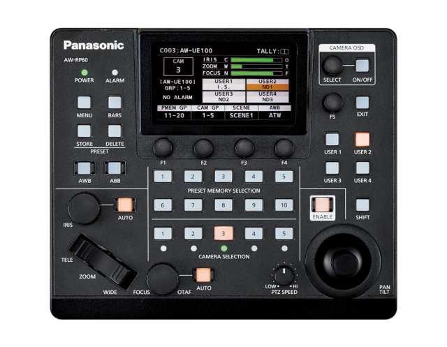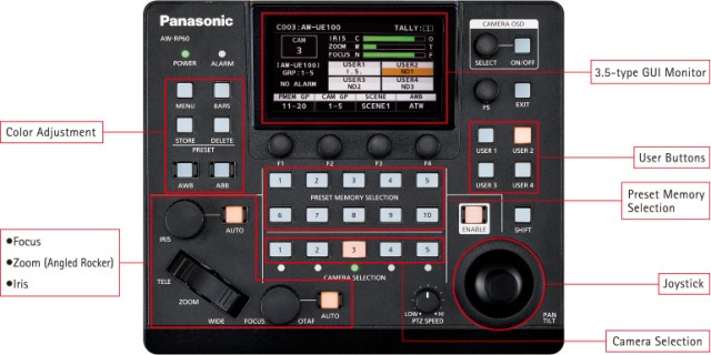 Az új joystick támogatja a sima pásztázási és dőlési műveleteket, és biztosítja a célkép pontos rögzítését. A joystick markolata körülbelül 1,5-szer nagyobb, mint a korábbi AW-RP50 modellé, így stabilabb működést valósít meg.