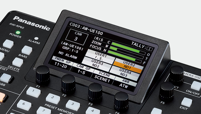 Az AW-RP60GJ 3,5-típusú LCD-képernyővel van felszerelve, amely egy olyan GUI-menüvel rendelkezik, ahol a szükséges információk egy pillantással elérhetőek az intuitív és gyors kameravezérlés érdekében.
