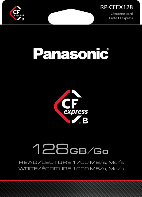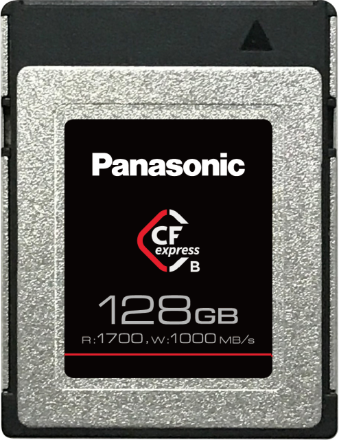 A Panasonic professzionális CFexpress 128 GB-os CF-kártyája nagy olvasási/írási sebességgel, amelyet hosszú távú használatra és biztonságos rögzítésre terveztek.