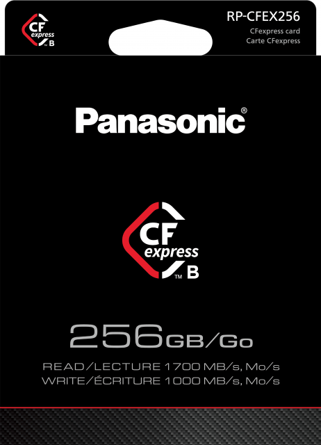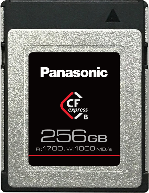 A Panasonic professzionális CFexpress 256 GB-os CF-kártyája nagy olvasási/írási sebességgel, amelyet hosszú távú használatra és biztonságos rögzítésre terveztek.