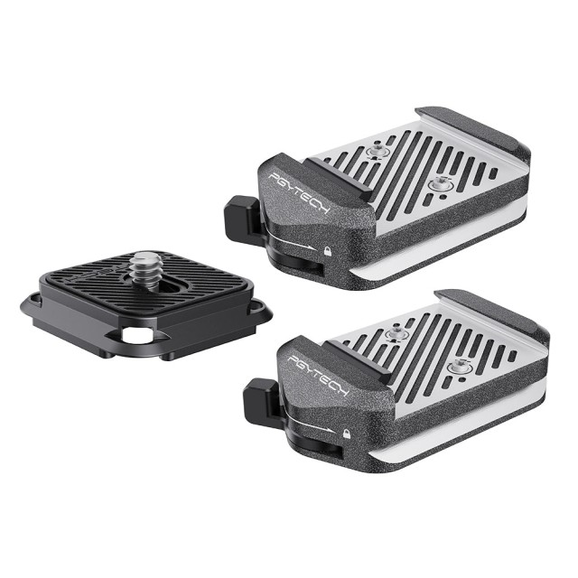 A PGYTECH Arca-Type Quick Release Clamp V2 Set egy két gyorskioldó kapcsot és egy lemezt tartalmazó készlet a gyors és megbízható kamerarögzítéshez.