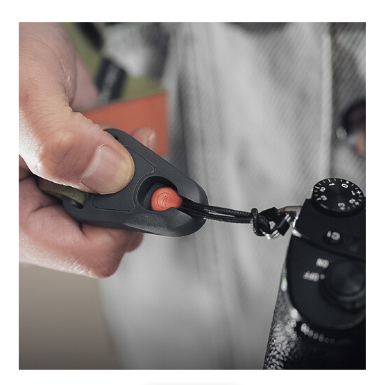 A heveder eredeti gyorscsatlakozókkal rendelkezik, amelyek központi reteszelő mechanizmussal vannak ellátva, így biztosítva, hogy a fényképezőgép biztonságban maradjon, amíg szándékosan ki nem oldja. A hurkok cserére figyelmeztető belső rétege jelzi, ha biztonsági okokból cserélni kell. A mindkét oldalon található állítható gyorsbeállítók segítségével a hevedert a nyak, a váll vagy a keresztben való hordozáshoz ideális hosszúságúra állíthatja be.