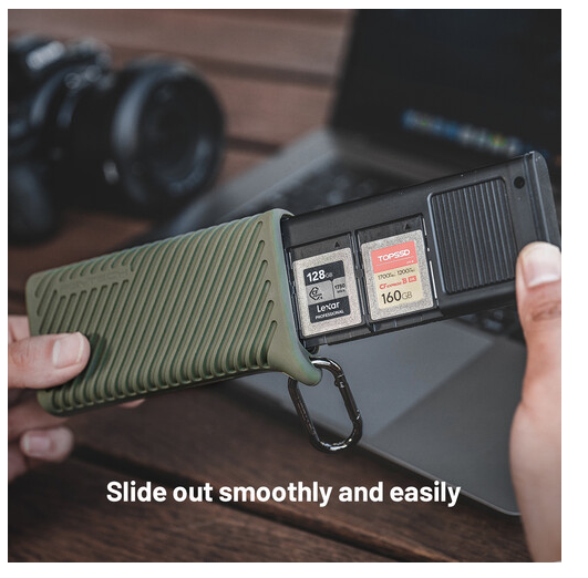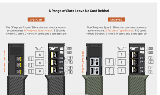 Akár 12 kártya tárolására alkalmas: 3 CFexpress Type A, 3 SD, 4 microSD, 2 Nano SIM