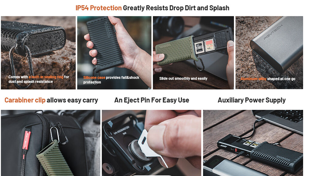 Az IP54 minősítésű alumínium tok szilikon védelemmel és tömítőgyűrűvel véd a leejtés, a por és a fröccsenő víz ellen, míg a karabiner segítségével könnyen rögzíthető a táskákhoz. A kiegészítő USB-C tápcsatlakozó (5V/2A) biztosítja a stabil adatátvitelt. A plug-and-play kompatibilitás kiterjed a Windows, macOS, Linux, Android és iPadOS eszközökre, így egyszerűen átvihetők az adatok kamerákból, drónokból vagy akciókamerákból az Ön eszközeire. Kompakt, könnyű és rendkívül tartós, ez a kártyaolvasó tok sokoldalú megoldás a médiafájlok kezelésére útközben.