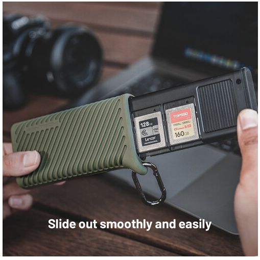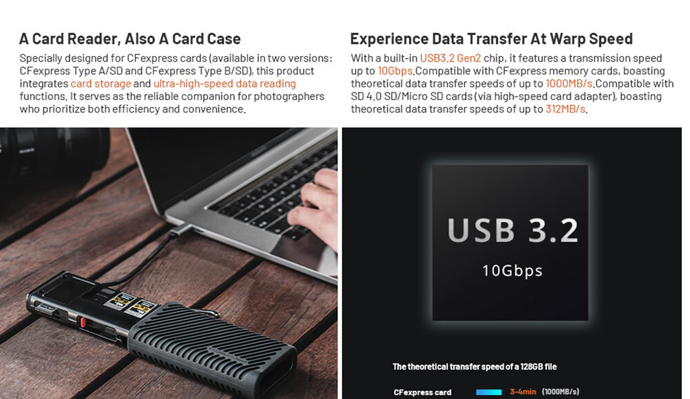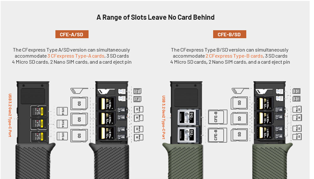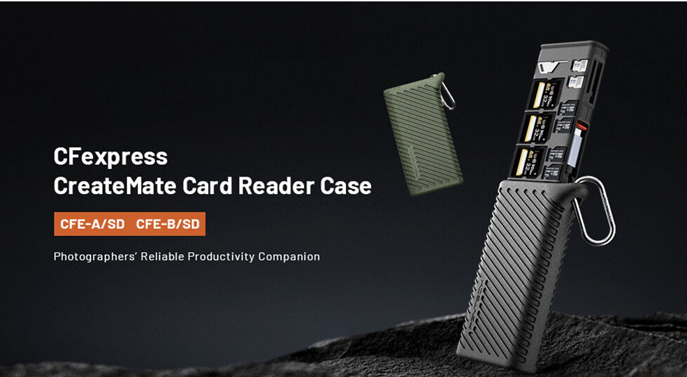A kettős kártyanyílások lehetővé teszik a CFexpress Type B és UHS-II SD kártyák olvasását (egyszerre egy), míg a mellékelt microSD-SD adapter még nagyobb sokoldalúságot biztosít. Az USB-C kiegészítő tápcsatlakozó (5 V/2 A) stabil és egyenletes adatátvitelt biztosít, míg az IP54 besorolású kialakítás védelmet nyújt a por, a szennyeződések és a fröccsenések ellen. A tokhoz karabiner klip is tartozik, amelynek segítségével könnyen rögzíthető táskára vagy hevederre, valamint egy multifunkcionális kiadócsap, amely megkönnyíti a kártyák eltávolítását. Plug-and-play kompatibilitása kiterjed a Windows 7+, macOS 10.6+, Linux, Android és iPadOS rendszerekre, így tökéletes kiegészítője kameráknak, drónoknak, akciókameráknak és okostelefonoknak.