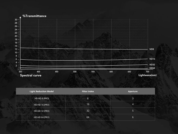 Négy ND szűrő: ND8 (3 f-stop), ND16 (4 f-stop), ND32 (5 f-stop), ND64 (6 f-stop)