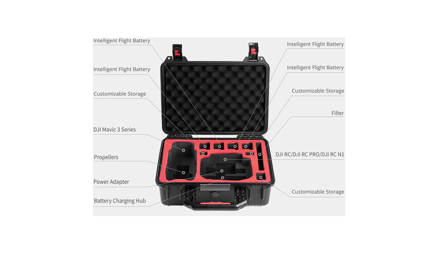 A tok előre kivágott habbetétekkel és egyedi rekeszekkel rendelkezik, amelyek biztonságosan tartják a drónt, a távirányítót, az akkumulátorokat és egyéb fontos kiegészítőket. A párnázott belső fedél extra párnázást biztosít az érzékeny berendezések számára. Az integrált nyomáscsökkentő szelep biztosítja a biztonságos légnyomás-beállítást repülés közben. A robusztus retesz zárható lakattal (nem tartozék) is felszerelhető a nagyobb biztonság érdekében. Könnyű, mégis tartós, ez a kemény héjú tok úgy lett kialakítva, hogy ellenálljon a igényes körülményeknek, miközben felszerelését rendezett és védett állapotban tartja.