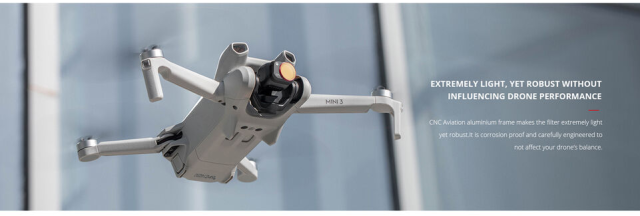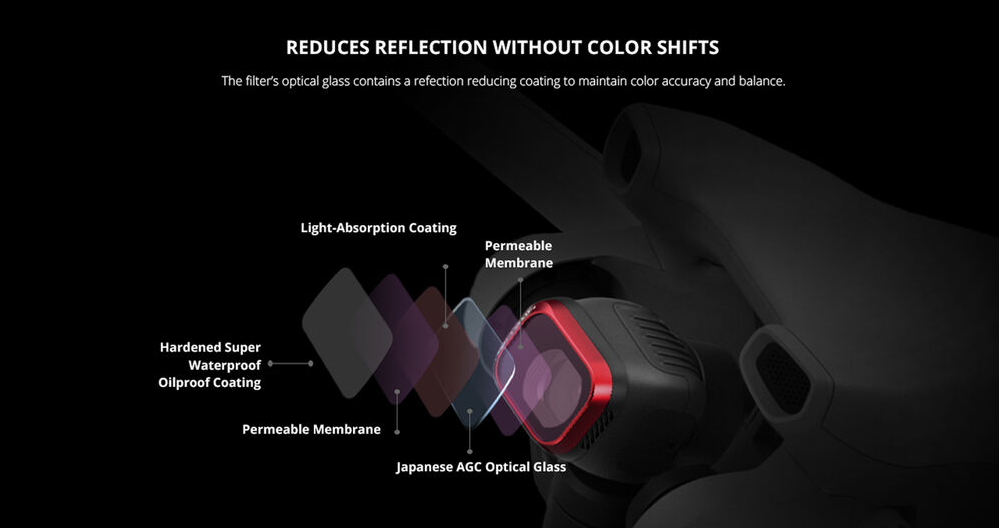 Minden szűrő precíziósan megmunkált japán AGC optikai üvegből készül, alacsony törésmutatóval, hogy pontos színvisszaadást és nagy felbontású képet biztosítson. A kétoldalas többrétegű bevonat víz-, olaj- és karcállóságot biztosít, így megbízhatóan használható kültéri és légi felvételekhez. A könnyű, de robusztus CNC alumínium keret korrózióálló és úgy lett kialakítva, hogy fenntartsa a megfelelő gimbal egyensúlyt, biztosítva a stabil repülési teljesítményt.