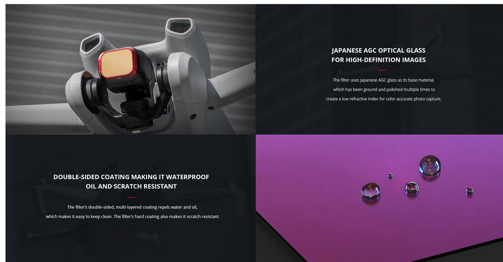 Védje DJI Mini 3 kameráját és javítsa a kép élességét a PGYTECH UV szűrővel. Japán AGC optikai üvegből és könnyű CNC alumínium keretből készült, ez a szűrő csökkenti az UV-ködöt, miközben megvédi a lencsét a karcolásoktól, az olajtól és a víztől.