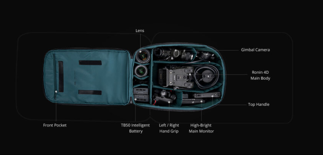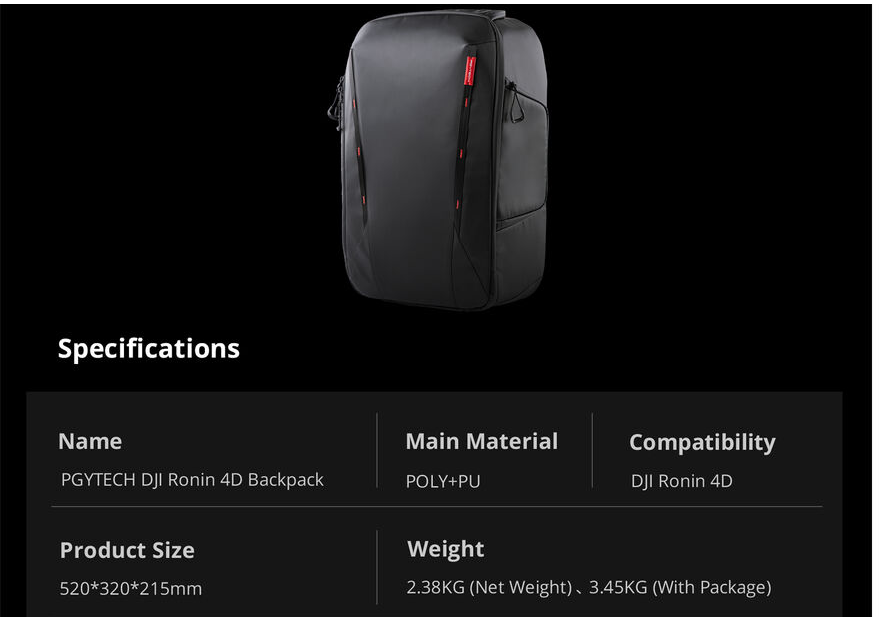 A PGYTECH P-CB-245 hátizsák a DJI Ronin 4D-hez egy integrált megoldás, amely biztonságos tárolást és mobil operatív támogatást kombinál a Ronin 4D gimbal rendszerhez. A hátizsákot a teljes Ronin 4D készlet szállítására tervezték, és tépőzáras, állítható elválasztókkal rendelkezik, amelyekkel hatékonyan rendezhető a gimbal test, az akkumulátorok, az objektívek és a kiegészítők.