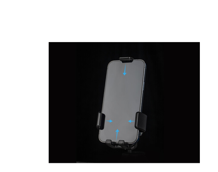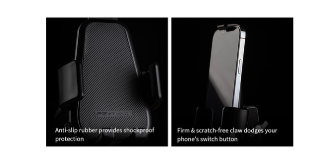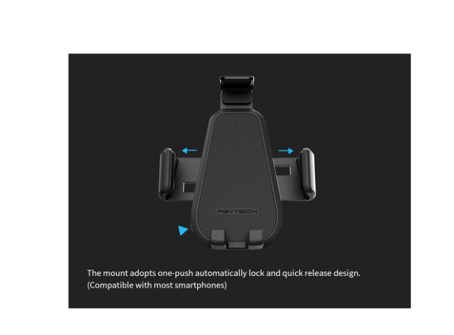 A tartó nyomógombos nyitással és összenyomható felső és oldalsó bilincsekkel rendelkezik, csúszásgátló gumibetéttel és stabilizáló lábakkal kombinálva, így biztosítva, hogy telefonját minden oldalról biztonságosan tartsa. A gömbfejű tartó 180°-os dőlésszöget és 360°-os forgást biztosít a pontos szögbeállításhoz, míg a lábak közötti térben opcionális táp- vagy adatkábel helyezhető el. A tartó 300 g-ig terjedő súlyú okostelefonokat támogat, és ötvözi az erősséget, a rugalmasságot és a könnyű használatot.