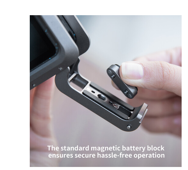 Az integrált mágneses akkumulátorblokk megbízható áramellátást biztosít, míg a kényelmes oldalsó reteszelő gomb lehetővé teszi az akkumulátorok vagy adathordozók cseréjét a keret eltávolítása nélkül. A nyitott USB-C port biztosítja a folyamatos töltést működés közben, így ez a keret kiváló választás hosszabb filmforgatásokhoz, vlogoláshoz és professzionális tartalomkészítéshez.