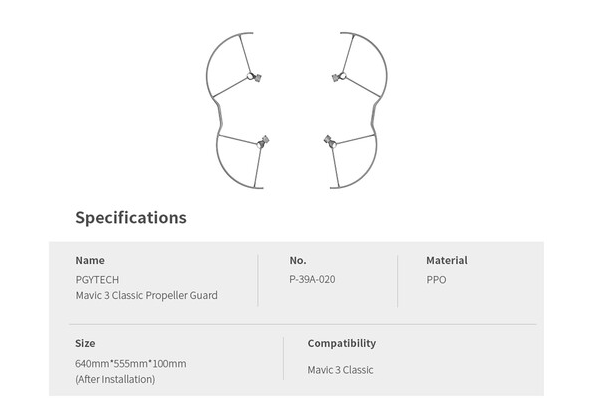 A PGYTECH P-39A-020 propellervédő a DJI Mavic 3 Classic számára növeli a repülés biztonságát azáltal, hogy védi a propellereket, az embereket és a környező tárgyakat. Nagy hajlítószilárdságú anyagból készült, könnyű védőburkolatok ideálisak beltéri repüléshez és kezdő pilóták számára.