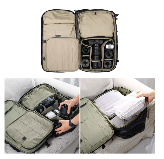A hátizsákot a maximális sokoldalúság érdekében úgy tervezték, hogy hagyományos hátizsákként, utazótáskaként vagy válltáskaként is hordható legyen a levehető deréköv és a kettős felső pántok segítségével. Tartalmaz egy párnázott rekeszt 16 hüvelykes laptopok számára, egy cipzáras, rugalmas elválasztót a rendezett csomagoláshoz, kettős oldalsó zsebeket kiegészítők számára, valamint pántokat az opcionális kamera-betét vagy ruha-tároló szett rögzítéséhez. A kényelem érdekében a hátizsák rejtett AirTag zsebbel, akkumulátor zsebekkel, hajtogatható, csatokkal ellátott tetejével és állvány/tripod tartóval is rendelkezik. A hálós, szellőző hátsó panel és a nyomáscsökkentő habszivacs pántok kényelmet biztosítanak hosszú utazások során, míg a mellékelt esővédő burkolat védelmet nyújt nedves körülmények között.