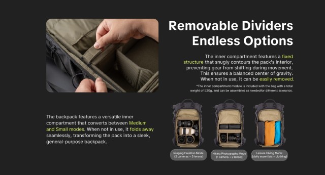 A hátizsák standard, kettős felhasználású belső rekesszel rendelkezik (közepes és kicsi konfigurációk között váltható). Ha nincs rá szükség, összehajtható, így a főzsák azonnal általános célú outdoor hátizsákká alakítható.