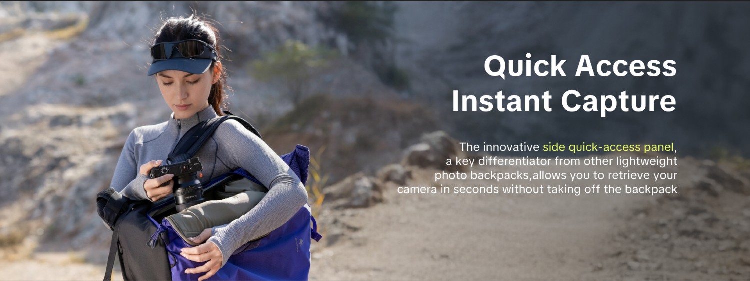 Az innovatív, oldalsó gyors hozzáférési panel, amely megkülönbözteti a többi könnyű fotós hátizsáktól, lehetővé teszi, hogy másodpercek alatt elővegye a fényképezőgépét anélkül, hogy le kellene vennie a hátizsákot.