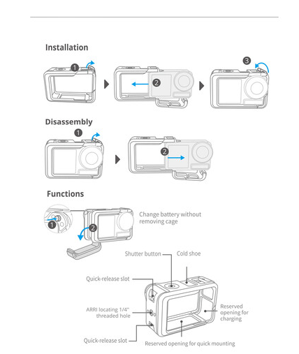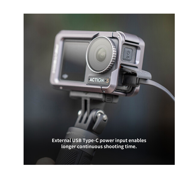 A keret felnyitható fedéllel rendelkezik, amely lehetővé teszi az USB-C áramellátás vagy töltés hozzáférését a kamera eltávolítása nélkül, így hosszú felvételek során is biztosítva a folyamatos működést. A kiegészítők felszereléséhez egy felső hideg cipő és egy 1/4"-20 menetes csatlakozó tartozik, amely rugalmasságot biztosít a lámpák, mikrofonok vagy egyéb kiegészítők felszereléséhez. Könnyű alumíniumötvözetből készült szerkezete minimális súlyt ad hozzá, miközben erős védelmet biztosít.