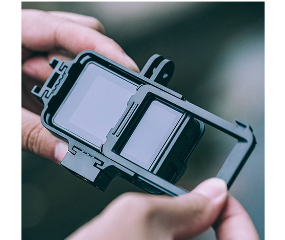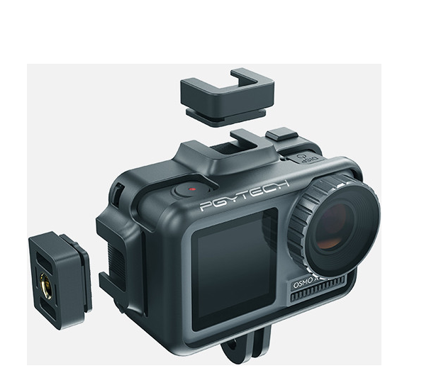 A PGYTECH kamera tartókeret az Osmo Action kamerához többféle kiegészítő rögzítési ponttal rendelkezik, így mikrofonokat, lámpákat és markolatokat is felszerelhet rá, miközben a kamera képernyője és vezérlői továbbra is teljes mértékben hozzáférhetők maradnak.