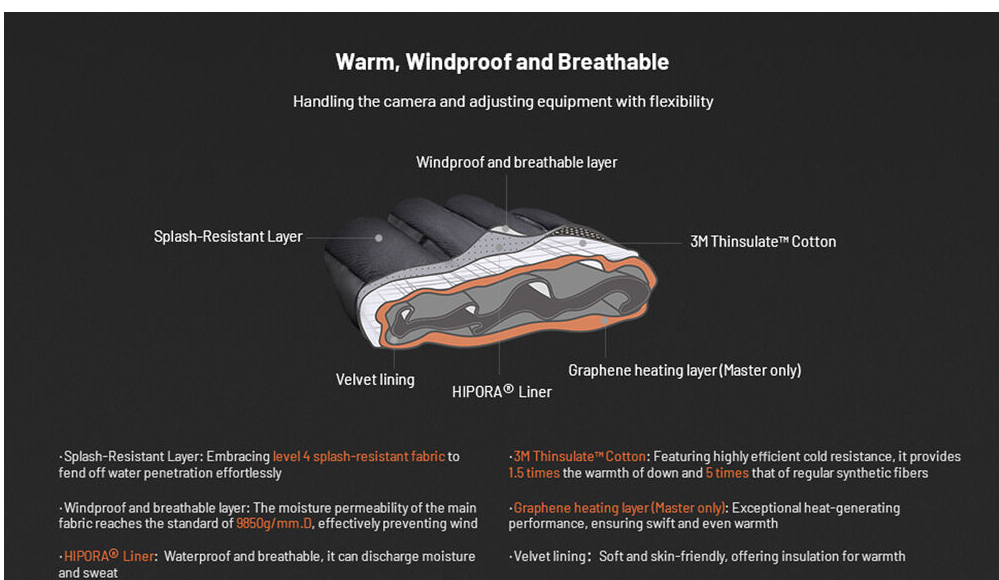 A PGYTECH P-GM-201 Master Photography Gloves kesztyűket olyan szakemberek számára tervezték, akik zord téli körülmények között fényképeznek. A kesztyűk fejlett fűtési technológiát és prémium anyagokat kombinálnak, hogy meleget, mozgékonyságot és védelmet nyújtsanak. A kesztyűk középpontjában egy grafén fűtőréteg található, amelyet két 4000 mAh-s C-cellás elem táplál, és amely három állítható hőmérsékleti szinttel gyors, egyenletes hőt biztosít.