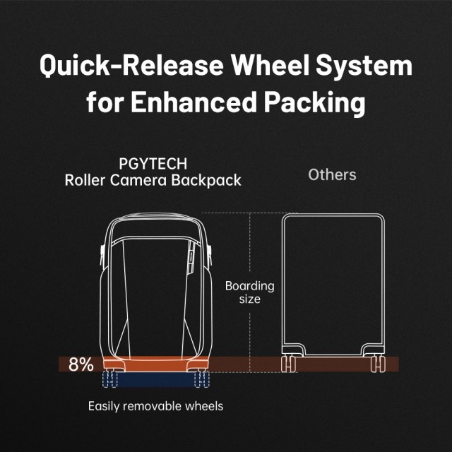 APGYTECH Roller Camera Backpack elegáns Space Black színben egyesíti a hátizsák és a gurulós bőrönd funkcionalitását, így könnyedén szállítja fotós felszerelését - akár a városban, akár a repülőtéren vagy a terepen mozog.