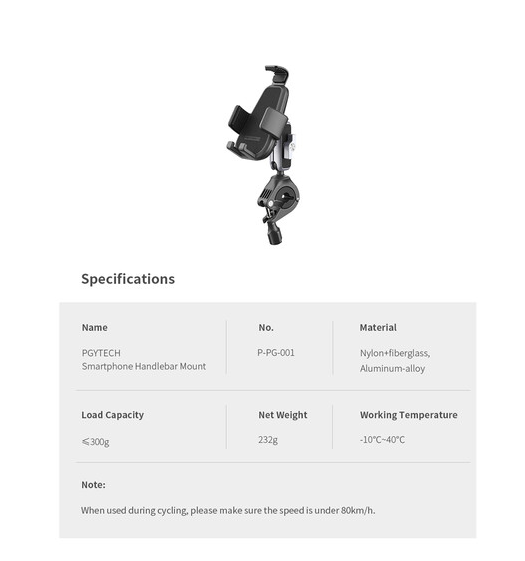 A PGYTECH P-PG-001 okostelefon-kormánytartóval okostelefonja mindig kéznél és biztonságban lesz utazás közben. Kerékpárokhoz, motorkerékpárokhoz és oldalsó tükör tartókarokhoz tervezett tartó 0,3–1,4 hüvelyk átmérőjű kormányokra rögzíthető, így a legtöbb szabványos kormányhoz kompatibilis. Teljes körű rögzítése teljes védelmet biztosít telefonjának, hátsó, oldalsó és felső részén csúszásgátló gumival, amely megakadályozza a csúszást és a rezgéseket.