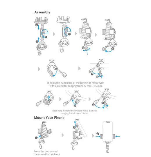 Biztonságosan rögzíti az okostelefonokat a kerékpár és a motorkerékpár kormányához vagy a visszapillantó tükör tartókarjaihoz