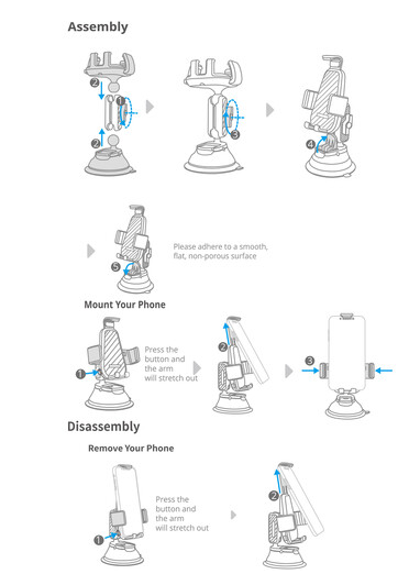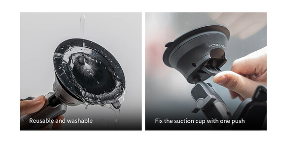 A kényelmet szem előtt tartva tervezett, nyomógombos gyorskioldó bilincs lehetővé teszi a telefon könnyed behelyezését és eltávolítását, míg a beépített portkivágás lehetővé teszi a töltő- vagy adatkábel csatlakoztatását használat közben. A tartós alumíniumötvözetből és megerősített műanyagból készült tapadókorong mosható és újrafelhasználható, hosszú távú megbízhatóságot biztosítva.