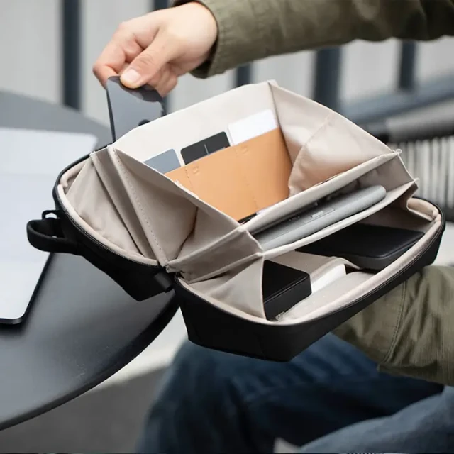 A praktikus kagylószerű nyitásnak köszönhetően könnyen hozzáférhet a tartalomhoz, függetlenül attól, hogy a tokot csak részben vagy teljesen kinyitja. Belül egy átgondolt zsebrendszer és rugalmas pántok találhatók, amelyek biztonságban és rendben tartják a kábeleket, töltőket, fejhallgatókat, powerbankokat, tollakat és egyéb apró kiegészítőket.