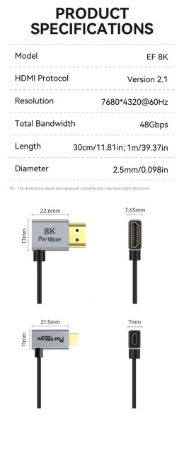 A Portkeys 8K HDMI kábel (A - Micro HDMI D) 0,3m egy prémium minőségű HDMI kábel, amely nagy felbontású videoátvitelre készült. Akár 8K felbontást is támogat, ultra-tiszta képminőséget és minimális jelzavarást biztosít, így nélkülözhetetlen eszköz a filmesek, tartalomkészítők és fotósok számára.