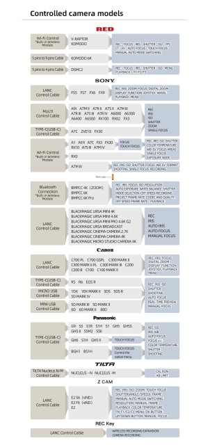- Vezeték nélküli távirányító RED Komodo, V-Raptor, Blackmagic Design BMPCC4K, BMPCC6K, BMPCC 6K Pro, Sony A7MIII, RX0, A1, A9II, A7C, FX3, FX30, RX10, A7SIII, A7MIV, A7SIII, A7C, FX3, FX30, RX10, A7SIII, A7MIV