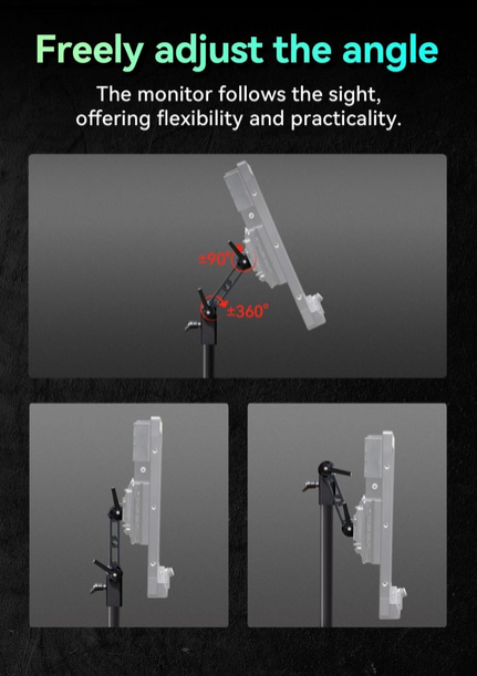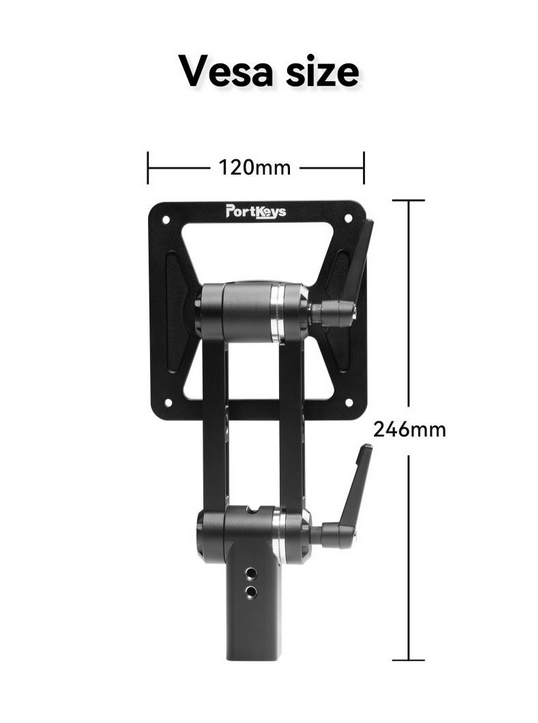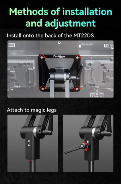 A Portkeys MT22DS VESA tartó egy sokoldalú rögzítőkonzol, amelyet az MT22DS monitorhoz terveztek, ±90°-os dőlésszöggel és ±360°-os forgathatósággal rendelkezik a rugalmas szögbeállítás érdekében, könnyen felszerelhető közvetlenül a monitor hátuljára vagy mágikus lábak segítségével, és VESA-kompatibilis mérete 120 mm x 246 mm.
