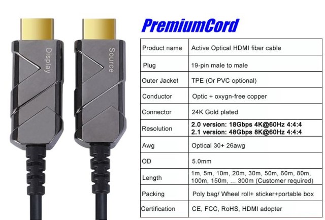 PremiumCord kphdm21x20 Ultra nagy sebességű HDMI 2.1 optikai szálas AOC kábel 8K @ 60Hz, aranyozott