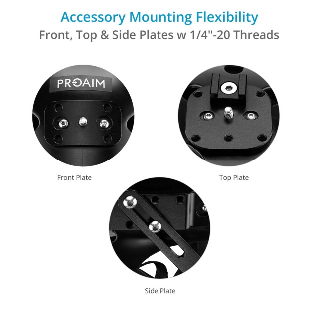 Első, felső és oldalsó rögzítőlemezekkel is rendelkezik, több 1/4”-20 menettel, hogy különböző lehetőségeket kínáljon a kamerák, külső tápegységek és egyéb kiegészítők, például kis videólámpák vagy mikrofonok rögzítéséhez.