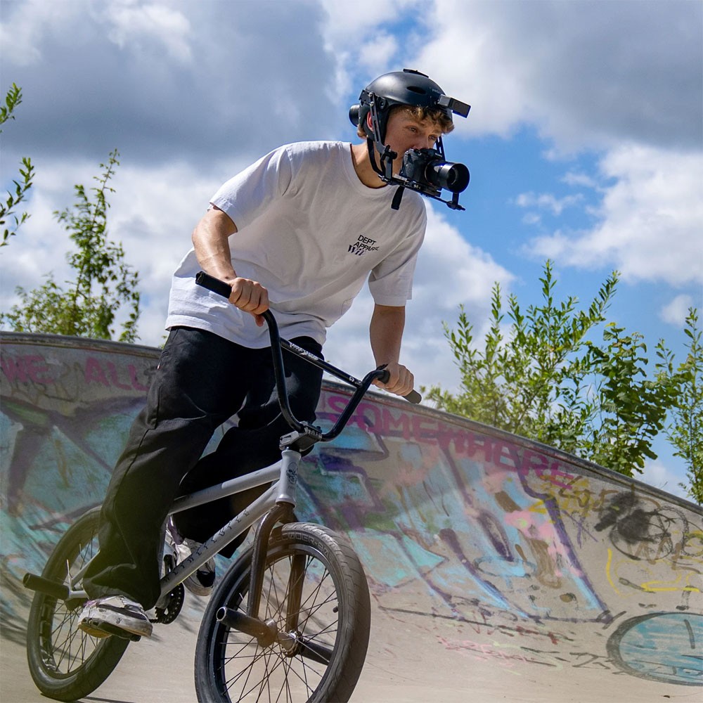 Sajátítsd el a szubjektív kamera és a „nézőpont felvétel” művészetét a Proaim Cam Surfer sisak rögzítővel, amely professzionális DSLR kamerával magával ragadó és stílusos POV felvételeket készít.