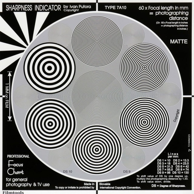 Az új Putora 7A10 élességmérő modell a legfejlettebb és legpontosabb tesztdiagram. Minden fotós képes lesz pontosan értékelni az élességet és a felbontást minden típusú film, videó és fényképezőgép esetében. Az élességjelző a háttérre nyomtatott koncentrikus körökkel ellátott tesztcélokból áll, a referenciamező szintjén. A háttérnek ugyanaz a fényvisszaverő képessége, mint a céltárgyak átlagos fényvisszaverő képessége. Ha a céltábla úgy tűnik, hogy beleolvad a háttérbe, a táblázat azt mutatja, hogy a céltábla a vizsgált rendszer fókuszán kívül van.