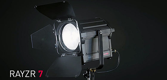 A fekete 7" 200W-os Daylight LED Fresnel fény (Premium Pack) a Rayzr-től 200W (100W + 100W) teljes kimeneti teljesítményt kínál, és passzív párahűtő rendszert használ. Színhőmérséklete 5600K (nappali fény), sugárzási szöge pedig 18-50°. A lámpa RJ45 DMX be / át vezérléssel és fedélzeti vezérlővel rendelkezik. A 7"-os LED Fresnel mellett a prémium csomag tartalmaz 4 szárnyas pajtaajtót, tápegységet és utazótáskát.
