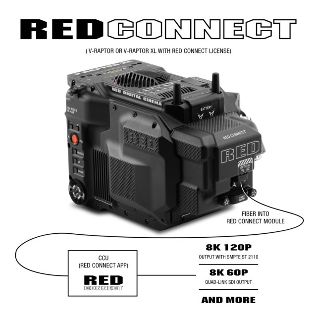 A RED Connect modul a V-RAPTOR vagy V-RAPTOR XL (V-Lock) kamerákhoz csatlakozik, és lehetővé teszi a 8K videó élő közvetítését a RED Connect segítségével. A RED Connect lehetővé teszi a felhasználók számára, hogy a RAW R3D fájlokat közvetlenül a V-RAPTOR és V-RAPTOR XL kamerarendszerekből IP-n keresztül valós időben streameljék a kameravezérlő egységre (CCU), megnyitva a kreatív alkalmazások rendkívüli skáláját az élő streamingtől a virtuális produkción át a valódi 8K VR produkcióig.