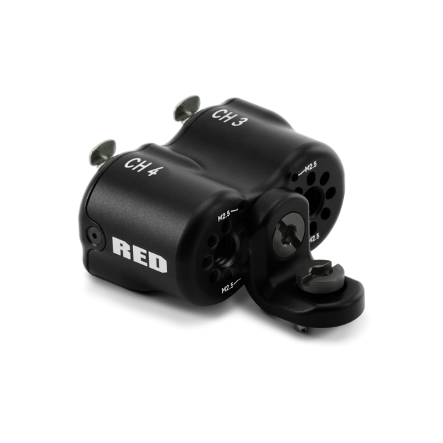 A DSMC3™ RED® 5-tűsből Dual XLR adapter egy kompakt megoldás az 5-tűs ODU portok Dual 3-tűs XLR portokra történő szétválasztására. Az adapter 48 V-os fantomteljesítményt képes biztosítani mikrofon- és vonalbemenettel, és ⅜-16 csavarral könnyen felszerelhető a V-RAPTOR® készülékre.
