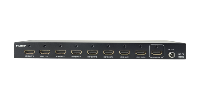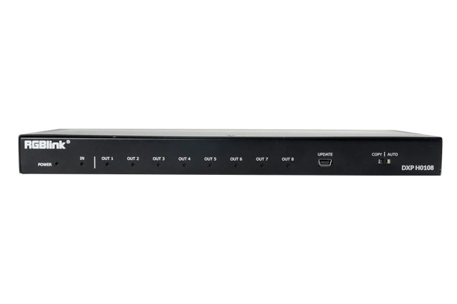 Az RGBlink DXP H0108 egy professzionális HDMI 2.0 videóelosztó, amely egy HDMI bemenetet fogad és azt egyszerre nyolc HDMI kimenetre továbbítja. 4096×2160 felbontást támogat 60 Hz-en, HDR és HDCP 2.2 kompatibilitással, így biztosítja a kiváló minőségű, veszteségmentes jelelosztást igényes AV alkalmazásokhoz.