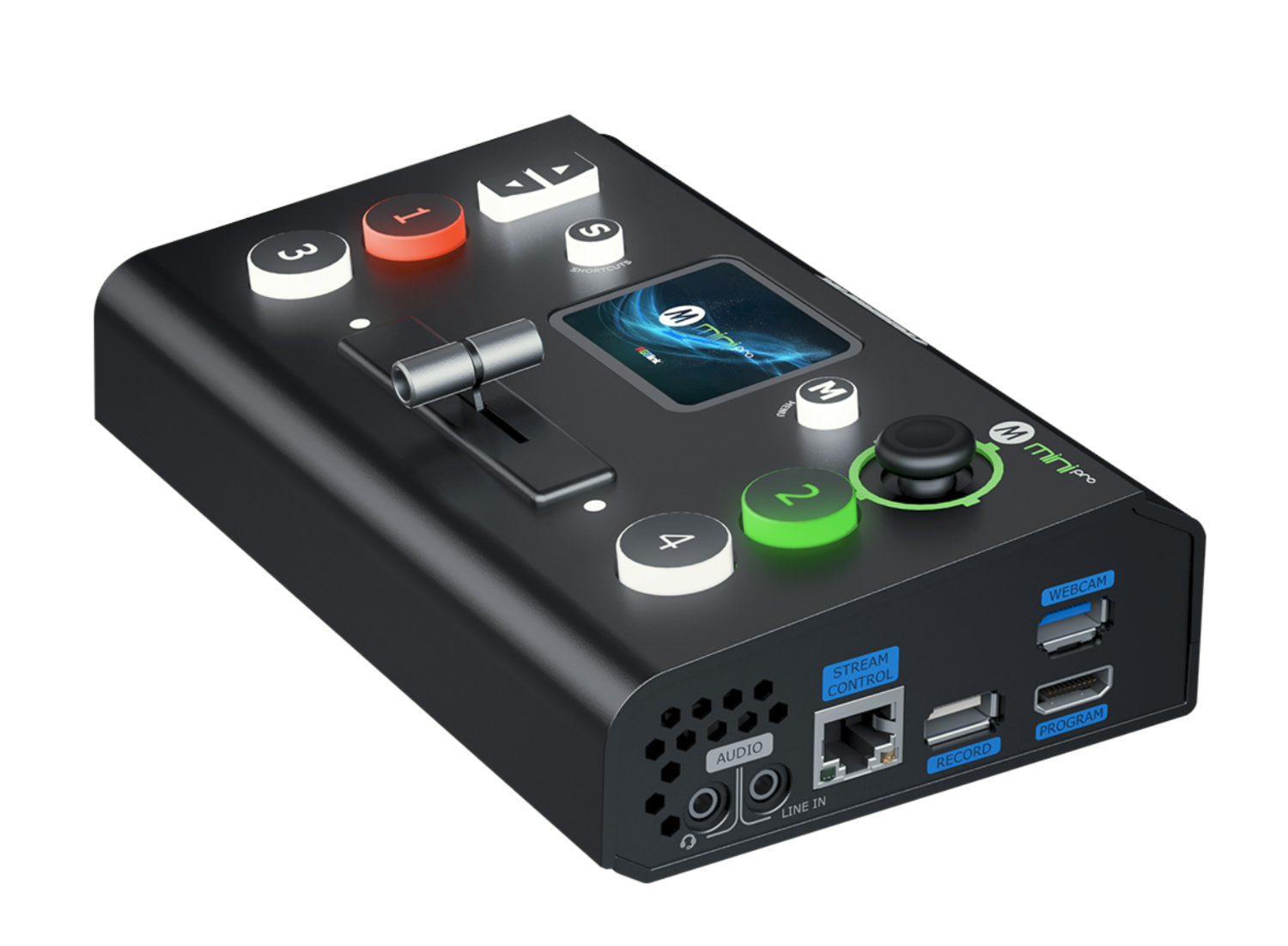 A beépített 2,1 hüvelykes, színes IPS érintőképernyő intuitív, ikon alapú menü navigációt biztosít a jelek monitorozásához, kapcsolásához és az effektusok vezérléséhez. Az érintőképernyőt kiegészíti a klasszikus ötirányú joystick és kapcsoló, amely lehetővé teszi az átmenetek, a PIP, a chroma key, a rétegbeállítások és a PTZ kamera vezérlésének zökkenőmentes működését IP VISCA-n keresztül, beleértve a PTZ előbeállítások egy kattintással történő mentését és visszahívását.