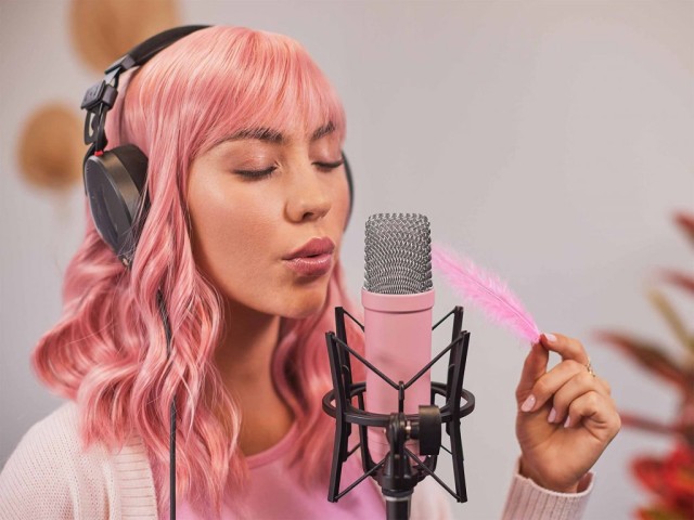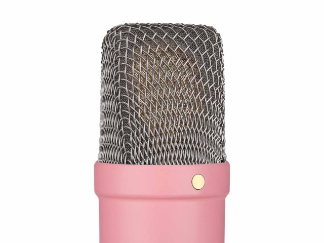 Nagymembrános stúdió kondenzátor mikrofon, 1" membrán, XLR(m) csatlakozó, magas dinamikai tartomány és hangnyomás SPL, rázkódásgátló kosár popszűrővel, mikrofonkábel, tömör mikrofontest, rózsaszín színű