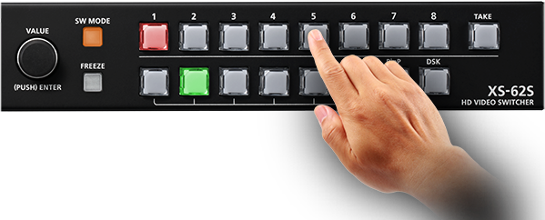 Az XS-62S videokapcsoló hat bemenetet képes zökkenőmentesen átkapcsolni, köztük 3G-SDI, HDMI és analóg (RGB, komponens és kompozit) forrásokat, valamint két, a belső memóriában tárolt állóképet. Három videokapcsolási mód választható, így az XS-62S széles körű alkalmazásokat tesz lehetővé.