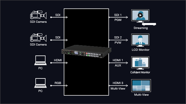 A PGM buszra keresztfeloldással történő videokapcsolás és kompozíció a Dissolve Mode használatával lehetséges. Az előlapról könnyen kezelhető, így kiválóan alkalmas olyan beállításokhoz, ahol a felhasználó közvetlenül a főegységet kezeli egy tárgyalóteremben vagy rendezvényen. És a PGM/PST módhoz hasonlóan a PGM-buszról és a PST-buszról is különböző videotartalmak kimenetére van lehetőség.
